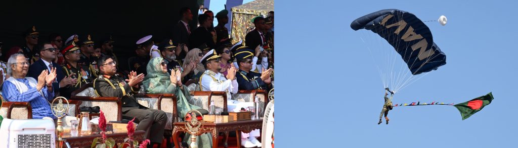 এবছর ৫৪তম বিজয় দিবস উপলক্ষ্যে গিনেস বুক অব ওয়ার্ল্ড রেকর্ডস অর্জনের জন্য ১২ হাজার ফুট উচ্চতা থেকে ৫৪ জন দক্ষ প্যারা জাম্পার পতাকা বহন করে প্যারা জাম্প করে। দিবসটিকে আরও মহিমান্বিত ও আকর্ষণীয় করে তুলতে জাতীয় প্যারেড স্কয়ারে মনোজ্ঞ ফ্লাই পাস্ট প্রদর্শিত হয়। নৌবাহিনীর সুদক্ষ প্যারা টুপারস এবং চৌকশ পাইলটগণ সেনা ও বিমান বাহিনীর সদস্যদের সাথে প্যারাজাম্প ও ফ্লাই পাস্টে অংশগ্রহণ করে অত্যন্ত সফলতার সাথে তাদের সক্ষমতা ও নৈপুণ্য প্রদর্শন করে। এই আয়োজনের মাধ্যমে জাতীয় চেতনায় উদ্বুদ্ধ সুপ্রশিক্ষিত নৌসদস্যরা তাদের উদ্যম, শৃঙ্খলা ও পেশাগত সক্ষমতার মাধ্যমে একটি শক্তিশালী ও আত্মবিশ্বাসী বাহিনী গঠনে দেশের মানুষকে আশান্বিত করে। সেই সাথে দিবসটির তাৎপর্য তুলে ধরে সংসদ ভবনের দক্ষিণ প্লাজায় অন্যান্য বাহিনীর সাথে নৌবাহিনীর অর্কেস্ট্রা দল এবং চট্টগ্রামের পতেঙ্গা সমুদ্র সৈকত ও খুলনার শহীদ হাদিস পার্কে বাংলাদেশ নৌবাহিনীর সুসজ্জিত ব্যান্ড দল মনোমুগ্ধকর বাদ্য পরিবেশনার মাধ্যমে তরুণ সমাজকে দেশপ্রেমে উদ্বুদ্ধ করে। এছাড়াও, বাংলাদেশ নৌবাহিনীর জাহাজসমূহের মধ্যে ঢাকা সদর ঘাঁটে বিএনডিবি গাংচিল, নৌ ইউনিট নারায়ণগঞ্জ নেভাল বার্থে বানৌজা শহীদ ফরিদ, চট্টগ্রাম নেভাল বার্থে বানৌজা সমুদ্র জয়, খুলনা বিআইডব্লিউটিএ লঞ্চ টার্মিনালে বানৌজা পদ্মা, মোংলা দিগরাজ নেভাল বার্থে বানৌজা আবু বকর, বরিশাল বিআইডব্লিউটিএ ঘাঁটে বানৌজা অদম্য এবং পটুয়াখালী পায়রা বন্দর জেটিতে বানৌজা কুশিয়ারা ১২০০ হতে ১৬০০ ঘটিকা পর্যন্ত সর্বসাধারণের পরিদর্শনের জন্য উন্মুক্ত রাখা হয়। পাশাপাশি চট্টগ্রামের লাভলেইনে অবস্থিত মেরিটাইম মিউজিয়াম জনসাধারণের জন্য উন্মুক্ত রাখা হয়। নৌবাহিনীর জাহাজ ও মিউজিয়াম পরিদর্শন এবং বাদ্য পরিবেশনা উপভোগ করতে পেরে জনসাধারণ অত্যন্ত উচ্ছ্বসিত।
