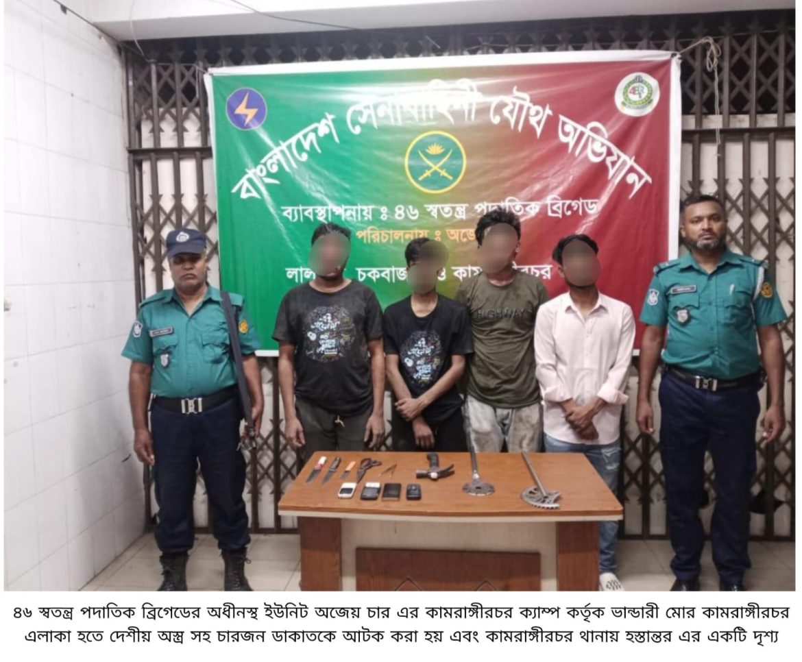 দেশের সার্বিক আইনশৃঙ্খলা পরিস্থিতি স্বাভাবিক রাখতে বাংলাদেশ সেনাবাহিনী কর্তৃক এ ধরনের অভিযান অব্যাহত রয়েছে। সাধারণ জনগণকে যেকোন সন্দেহজনক কার্যকলাপের বিষয়ে নিকটস্থ সেনা ক্যাম্পে তথ্য প্রদান করার জন্য অনুরোধ জানানো হচ্ছে।