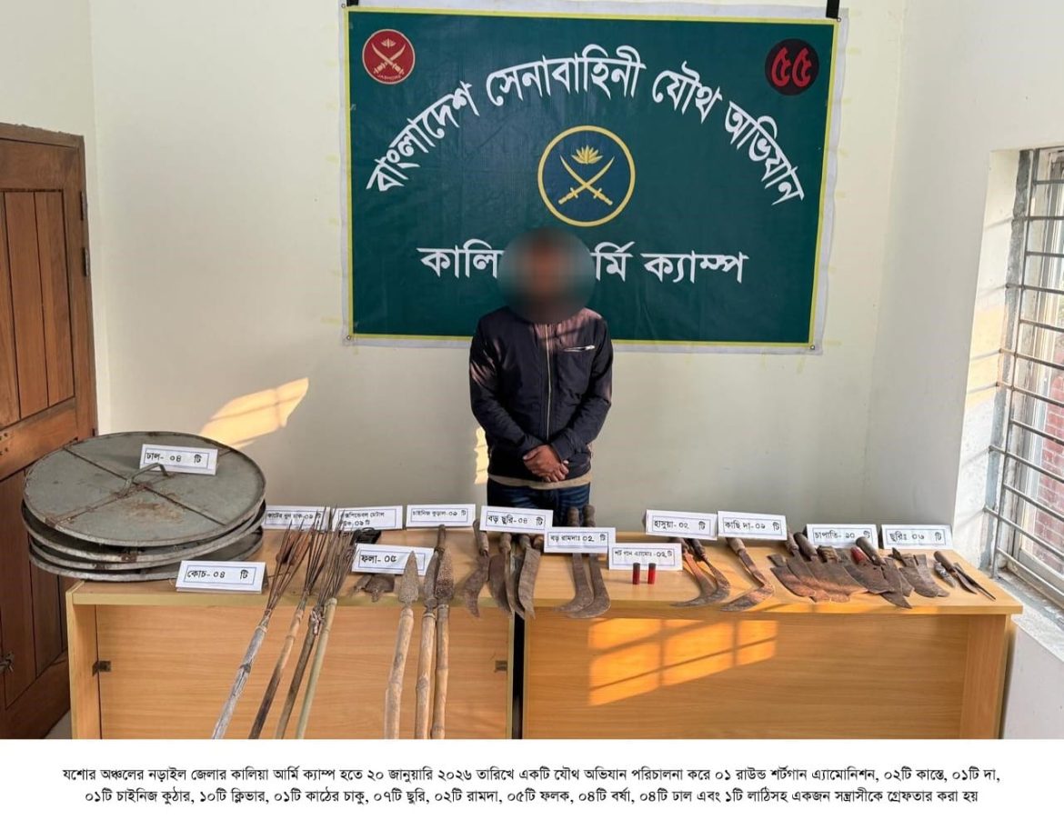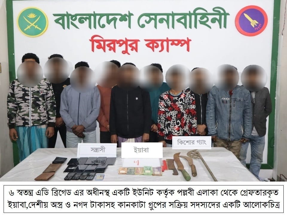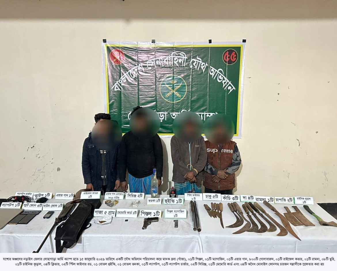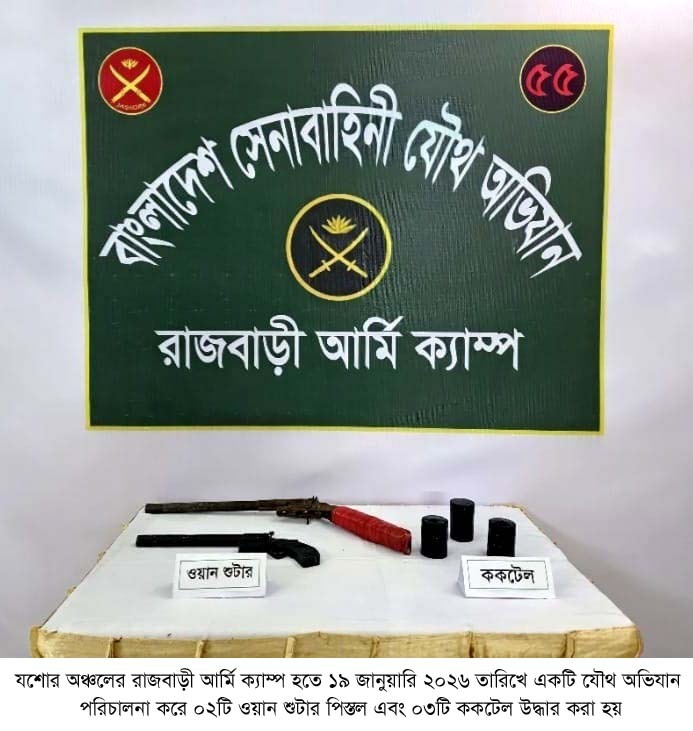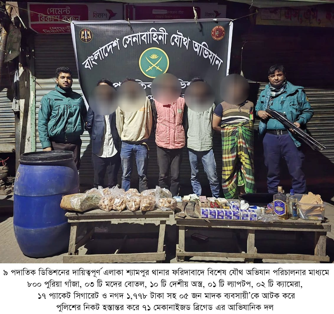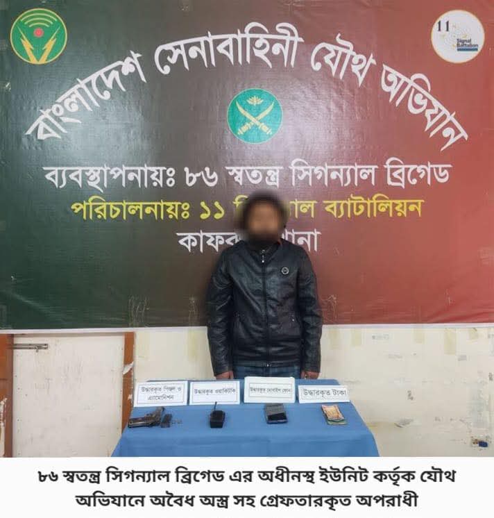 ঢাকা, ২৩ জানুয়ারি ২০২৬ (শুক্রবার): দেশের চলমান পরিস্থিতিতে সামগ্রিক আইনশৃঙ্খলা পরিস্থিতি নিয়ন্ত্রণে রাখার উদ্দেশ্যে বাংলাদেশ সেনাবাহিনী সর্বোচ্চ পেশাদারিত্ব, শৃঙ্খলা ও নিষ্ঠার সাথে দায়িত্ব পালন করে যাচ্ছে। এরই ধারাবাহিকতায়, গত ১৬ জানুয়ারি ২০২৬ থেকে ২২ জানুয়ারি ২০২৬ তারিখ পর্যন্ত বাংলাদেশ সেনাবাহিনীর বিভিন্ন পদাতিক ডিভিশন ও স্বতন্ত্র ব্রিগেডের অধীনস্থ ইউনিটসমূহ কর্তৃক অন্যান্য আইনশৃঙ্খলা রক্ষাকারী বাহিনীর সমন্বয়ে রাজধানীসহ দেশের বিভিন্ন এলাকায় বেশকিছু যৌথ অভিযান পরিচালনা করা হয়। এ সকল যৌথ অভিযানে সন্ত্রাসী, মাদক ব্যবসায়ী, মাদকাসক্ত, ডাকাত সদস্য, কিশোর গ্যাং, চোরাকারবারিসহ মোট ২৭৮ জন সন্দেহভাজন অপরাধীকে হাতেনাতে গ্রেফতার করা হয়। গ্রেফতারকৃতদের নিকট হতে ২২ টি অবৈধ আগ্নেয়াস্ত্র, ৮২২ রাউন্ড বিভিন্ন ধরনের গোলাবারুদ, ৭ টি ককটেল, দেশীয় অস্ত্র ও মাদকদ্রব্য উদ্ধার করা হয়। আটককৃতদের প্রয়োজনীয় জিজ্ঞাসাবাদ এবং আইনি কার্যক্রম সম্পন্নের জন্য সংশ্লিষ্ট এলাকার থানায় হস্তান্তর করা হয়েছে।