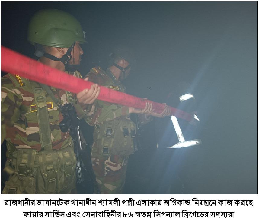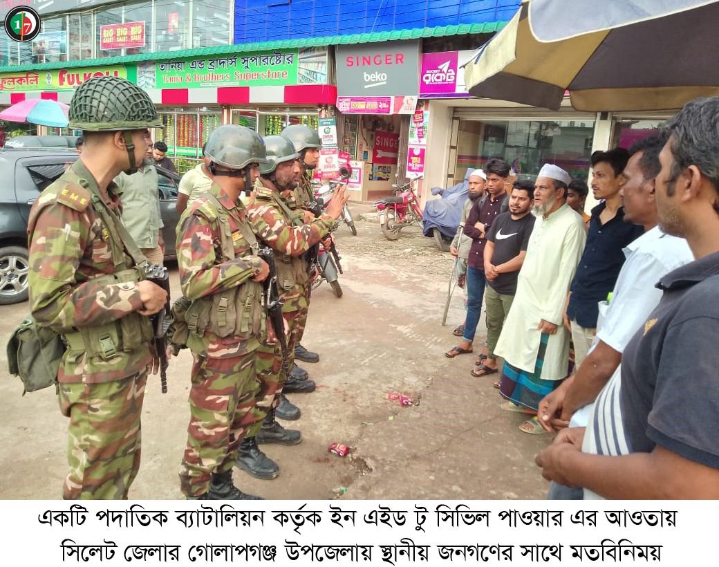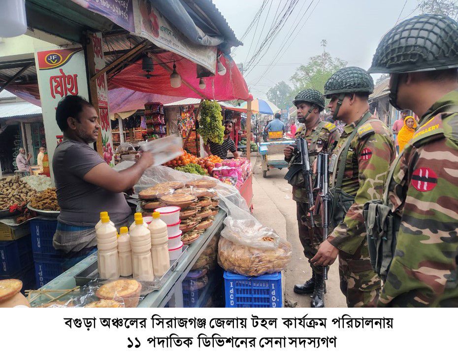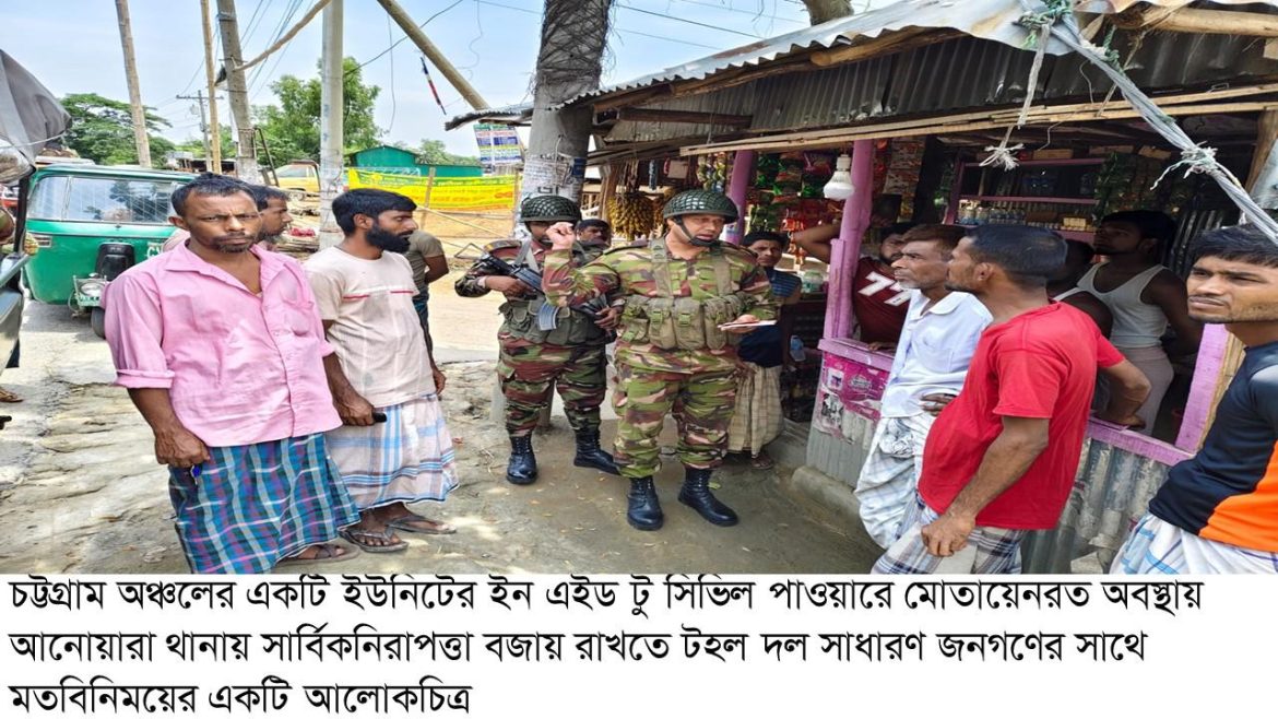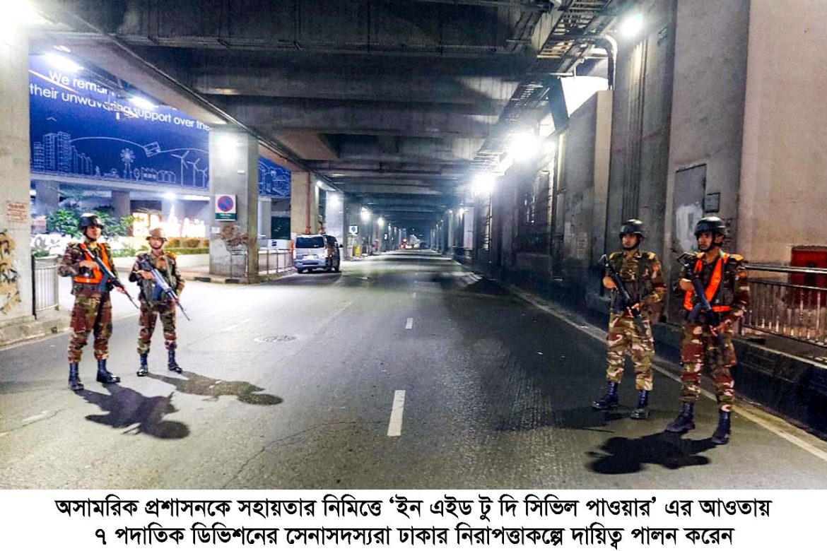 দেশব্যাপী জননিরাপত্তা নিশ্চিত করতে বাংলাদেশ সেনাবাহিনী বিভিন্ন এলাকায় নিয়মিত টহল ও নিরাপত্তা কার্যক্রম পরিচালনা করছে। শিল্পাঞ্চলসমূহে শ্রমিক অসন্তোষ প্রশমনে সেনা টহলদল গুরুত্বপূর্ণ ভূমিকা পালন করেছে। একইসঙ্গে, বিভিন্ন স্থানে দুর্ঘটনামূলক অগ্নিকাণ্ডের ঘটনায় ফায়ার সার্ভিসের পাশাপাশি বাংলাদেশ সেনাবাহিনী সদস্যগণ জনগণের জানমাল রক্ষায় সরাসরি অগ্নি নির্বাপনে অংশ নেয়।