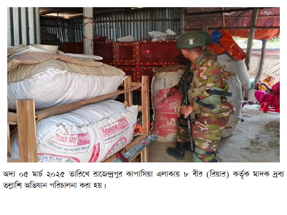 ঢাকা, ০৬ মার্চ ২০২৫ (বৃহস্পতিবার): দেশের চলমান পরিস্থিতিতে জনসাধারণের জান-মালসহ সার্বিক নিরাপত্তা এবং আইন-শৃংখলা পরিস্থিতি নিয়ন্ত্রণের পাশাপাশি আইন-বহির্ভূত কর্মকান্ড রোধ ও আইনের শাসন সমুন্নত রাখার লক্ষ্যে দেশব্যাপী নিরপেক্ষতা ও পেশাদারিত্বের সাথে কাজ করছে বাংলাদেশ সেনাবাহিনী।