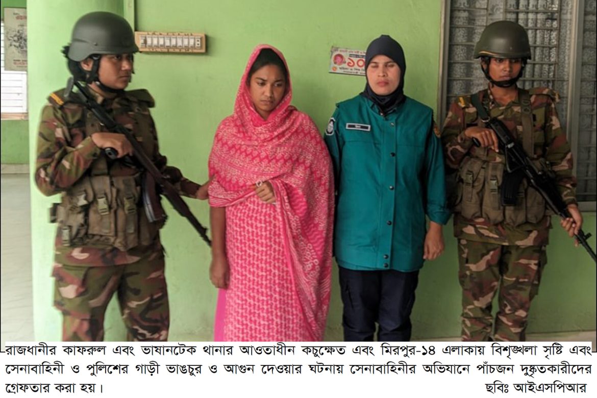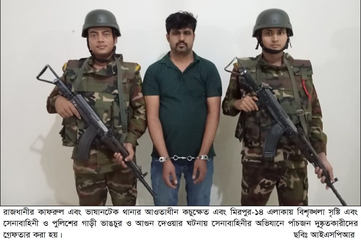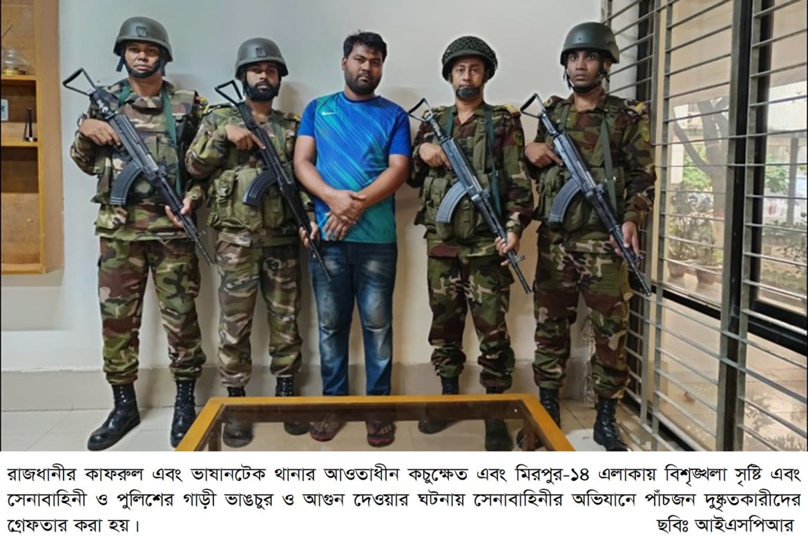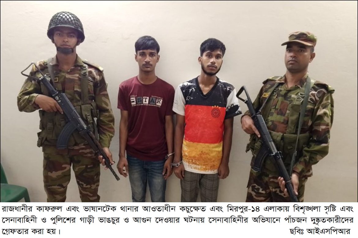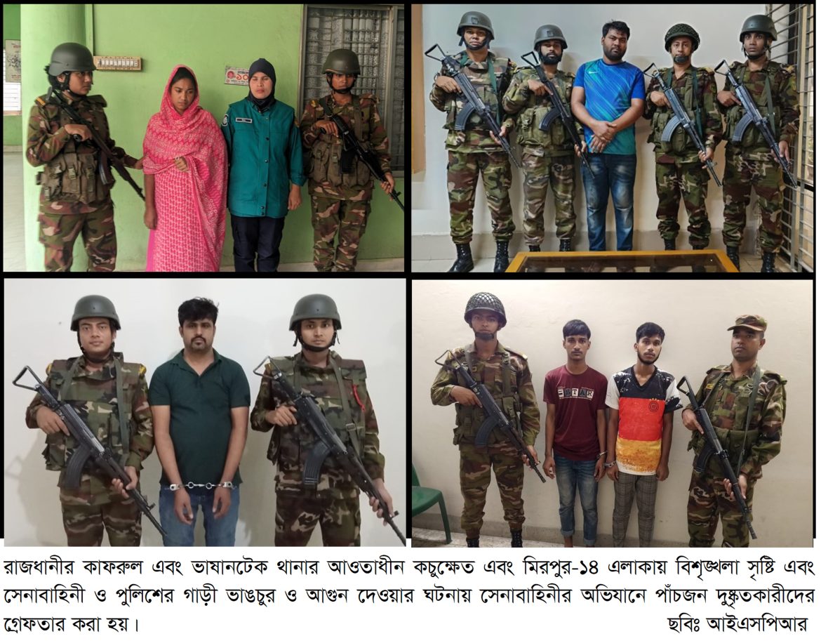 ঢাকা, ০২ নভেম্বর ২০২৪: রাজধানীর কাফরুল এবং ভাষানটেক থানার আওতাধীন কচুক্ষেত এবং মিরপুর ১৪ এলাকায় গত ৩১ অক্টোবর ২০২৪ তারিখে দুষ্কৃতিকারীরা সেনাবাহিনী ও পুলিশের গাড়িতে ভাঙচুর এবং পরে আগুন দিয়ে অরাজকতা সৃষ্টি করে। আইনশৃঙ্খলা বাহিনীর উপর আক্রমণ ও সরকারি সম্পত্তি ধ্বংসের পরিপ্রেক্ষিতে পরিচালিত যৌথ অভিযানের ধারাবাহিকতায় আজ ০২ নভেম্বর ২০২৪ (শনিবার) সেনাবাহিনী কর্তৃক আলমগীর, রেশমা খাতুন, মাহফুয মিয়া, আমিনুল ইসলাম এবং কাজী রাসেল নামক ০৫ জন দুষ্কৃতিকারীকে ভাষানটেক এবং কাফরুল এলাকা হতে আটক করা হয়। পরে প্রয়োজনীয় জিজ্ঞাসাবাদ ও আইনি কার্যক্রম সম্পন্নের জন্য তাদেরকে ভাষানটেক এবং কাফরুল থানা পুলিশের নিকট হস্তান্তর করা হয়েছে।