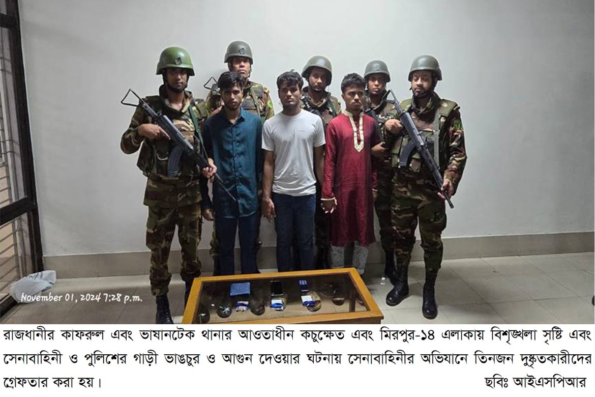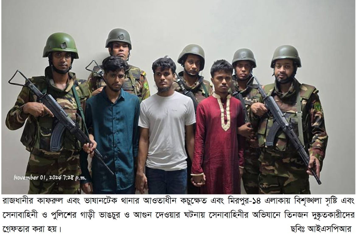 ঢাকা, ০১ নভেম্বর ২০২৪: রাজধানীর কাফরুল এবং ভাষানটেক থানার আওতাধীন কচুক্ষেত এবং মিরপুর ১৪ এলাকায় গত ৩১ অক্টোবর ২০২৪ তারিখে দুষ্কৃতকারীরা সেনাবাহিনী ও পুলিশের গাড়িতে ভাঙচুর এবং পরে আগুন দিয়ে অরাজকতা সৃষ্টি করে। আইনশৃঙ্খলা বাহিনীর উপর আক্রমণ ও সরকারি সম্পত্তি ধ্বংসের পরিপ্রেক্ষিতে ৩১ অক্টোবর ২০২৪ তারিখ (বৃহস্পতিবার) থেকে যৌথ অভিযান শুরু করে বাংলাদেশ সেনাবাহিনী। সেনাবাহিনী কর্তৃক বিভিন্ন সাঁড়াশি অভিযান পরিচালনার মাধ্যমে ০১ নভেম্বর ২০২৪ তারিখ (শুক্রবার) রিফাত, হৃদয় এবং ইয়াসিন নামক ০৩ জন দুষ্কৃতকারীকে ভাষানটেক এলাকা থেকে আটক করা হয়। পরে প্রয়োজনীয় জিজ্ঞাসাবাদ ও আইনী কার্যক্রম সম্পন্নের জন্য তাদেরকে ভাষানটেক থানা পুলিশের নিকট হস্তান্তর করা হয়েছে।