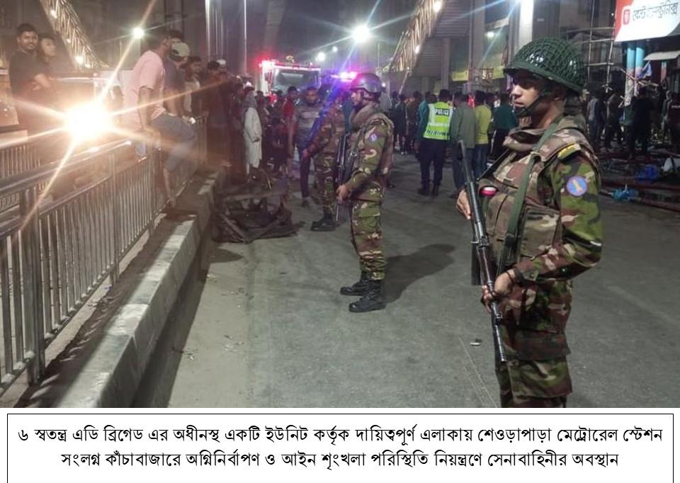 ঢাকা, ০১ মার্চ ২০২৫ (শনিবার): দেশের চলমান পরিস্থিতিতে জনসাধারণের জান-মালসহ সার্বিক নিরাপত্তা এবং আইন-শৃংখলা পরিস্থিতি নিয়ন্ত্রণের পাশাপাশি আইন-বহির্ভূত কর্মকান্ড রোধ ও আইনের শাসন সমুন্নত রাখার লক্ষ্যে দেশব্যাপী নিরপেক্ষতা ও পেশাদারিত্বের সাথে কাজ করছে বাংলাদেশ সেনাবাহিনী।