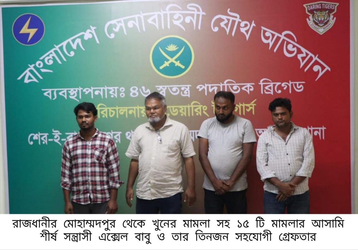 ঢাকা, ২৭ মে ২০২৫(মঙ্গলবার): রাজধানীর মোহাম্মদপুরের বুড়িগঙ্গা ফিলিং স্টেশন এলাকায় সুনির্দিষ্ট গোয়েন্দা তথ্যের ভিত্তিতে আজ মঙ্গলবার (২৭-৫-২০২৫) বিকাল আনুমানিক সাড়ে তিনটায় বাংলাদেশ সেনাবাহিনীর বসিলা সেনা ক্যাম্প থেকে একটি বিশেষ অভিযান পরিচালনার মাধ্যমে দুর্ধর্ষ সন্ত্রাসী ফরিদ আহমেদ বাবু ওরফে এক্সেল বাবু (৫৬) সহ আরও তিনজনকে গ্রেফতার করা হয়। গ্রেফতারকৃত ব্যক্তির বিরুদ্ধে রাজধানীর বিভিন্ন থানায় হত্যা, অস্ত্র, অপহরণ, চাঁদাবাজি এবং ভূমি দখলের মতো গুরুতর অভিযোগে ১৫টিরও অধিক মামলা রয়েছে।
