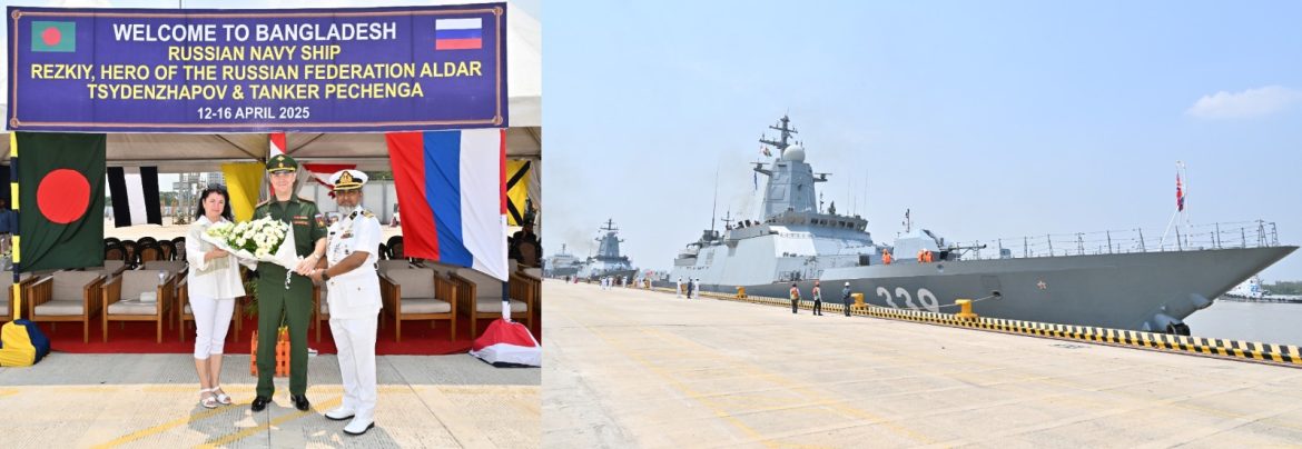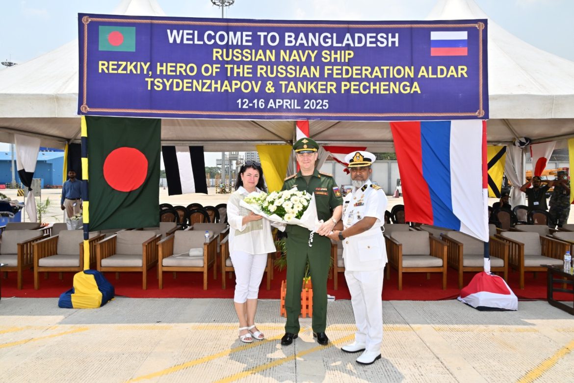 চট্টগ্রাম, ১৩ এপ্রিল ২০২৫ ঃ বাংলাদেশে চার দিনের শুভেচ্ছা সফরে রাশিয়ান নৌবাহিনীর তিনটি যুদ্ধজাহাজ ‘রেজিক’ (REZKIY), ‘হিরো অব দি রাশিয়ান ফেডারেশন আলদার সিডেনঝপভ’ HERO OF THE RUSSIAN FEDERATION ALDAR TSYDENZHAPOV এবং ‘পেচেঙ্গা’ (PECHENGA) আজ রবিবার (১৩-০৪-২০২৫) চট্টগ্রাম বন্দরে এসে পৌঁছায়। জাহাজসমূহ চট্টগ্রাম বন্দরে এসে পৌঁছালে কমান্ডার চট্টগ্রাম নৌ অঞ্চলের চিফ স্টাফ অফিসার জাহাজের কর্মকর্তা ও নাবিকদের স্বাগত জানান। এ সময় বাংলাদেশে নিযুক্ত রাশিয়ার মান্যবর রাষ্ট্রদূত, মিলিটারি, এয়ার এন্ড নেভাল অ্যাটাশে এবং চট্টগ্রামস্থ রাশিয়ান অনারারি কনস্যুলসহ নৌবাহিনীর স্থানীয় উচ্চপদস্থ কর্মকর্তাগণ উপস্থিত ছিলেন। এর আগে সফরকারী জাহাজসমূহ বাংলাদেশের জলসীমায় এসে পৌঁছালে নৌবাহিনী জাহাজ ‘বানৌজা খালিদ বিন ওয়ালিদ’ তাদের অভ্যর্থনা জানায়।