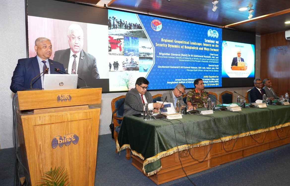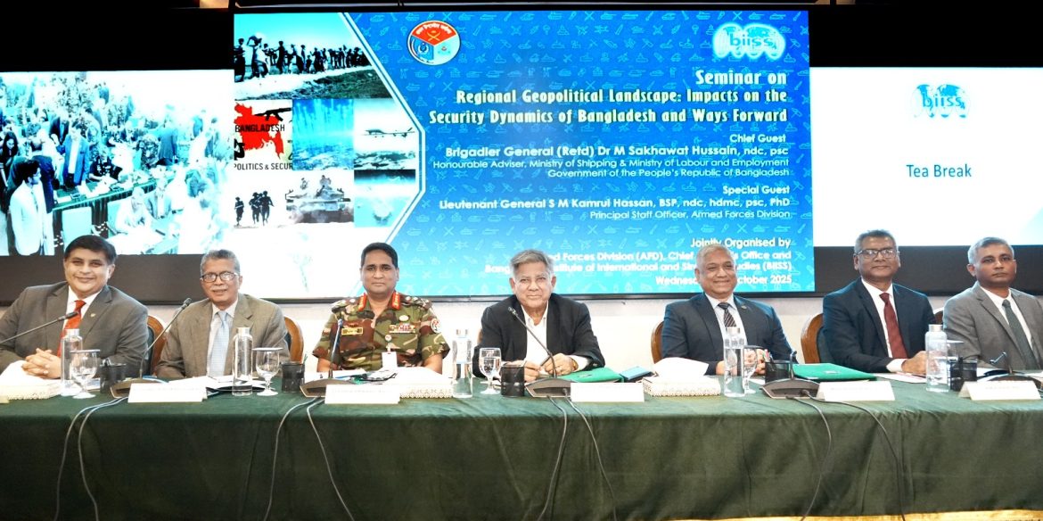 ঢাকা, ২২ অক্টোবর ২০২৫ (বুধবার)ঃ সশস্ত্র বাহিনী বিভাগ (এএফডি) ও বাংলাদেশ ইনস্টিটিউট অব ইন্টারন্যাশনাল অ্যান্ড স্ট্র্যাটেজিক স্টাডিজ (বিআইআইএসএস) এর যৌথ ব্যবস্থাপনায় ‘Regional Geopolitical Landscape: Impacts on the Security Dynamics of Bangladesh and Ways Forward’ শীর্ষক সেমিনার ২২ অক্টোবর ২০২৫ তারিখে বিআইআইএসএস এর মিলনায়তনে অনুষ্ঠিত হয়। উক্ত সেমিনারে প্রধান অতিথি হিসেবে নৌপরিবহন মন্ত্রণালয় এবং শ্রম ও কর্মসংস্থান মন্ত্রণালয়ের মাননীয় উপদেষ্টা ব্রিগেডিয়ার জেনারেল (অবঃ) ড. এম সাখাওয়াত হোসেন, এনডিসি, পিএসসি এবং বিশেষ অতিথি হিসেবে সশস্ত্র বাহিনী বিভাগের প্রিন্সিপাল স্টাফ অফিসার লেফটেন্যান্ট জেনারেল এস এম কামরুল হাসান, বিএসপি, এনডিসি, এইচডিএমসি, পিএসসি, পিএইচডি উপস্থিত ছিলেন। এছাড়াও সেমিনারে কূটনীতিক, বিভিন্ন দেশের রাষ্ট্রদূত ও সামরিক এ্যাটাশে, সশস্ত্র বাহিনীর কর্মকর্তাগণ, বিভিন্ন মন্ত্রণালয়/সংস্থার কর্মকর্তাবৃন্দ ও মিডিয়া ব্যক্তিবর্গ অংশগ্রহণ করেন।