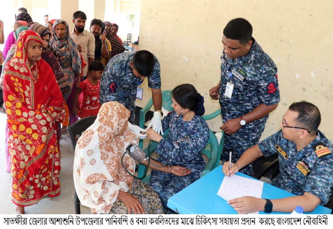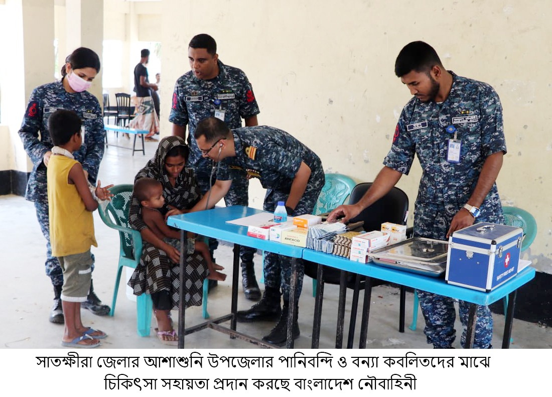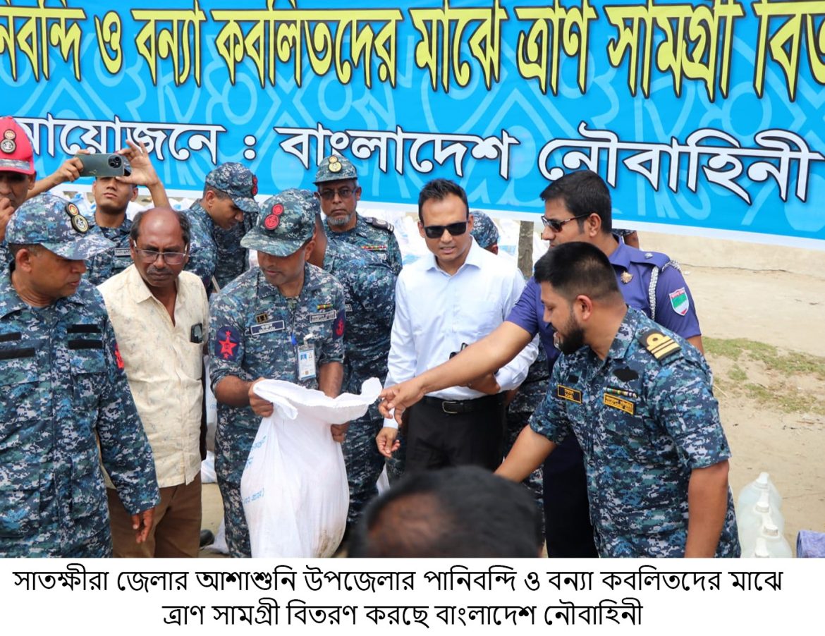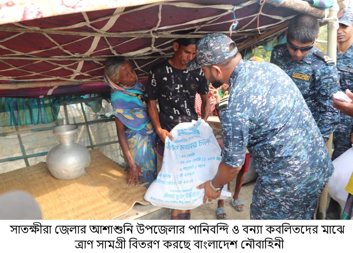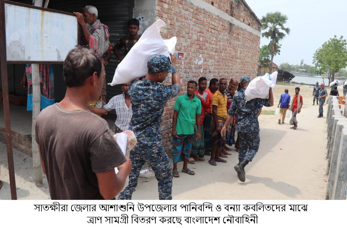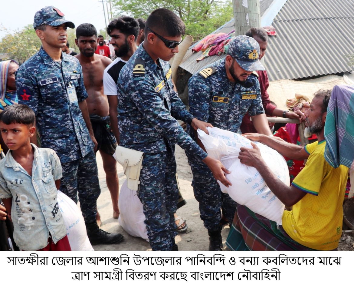 ঢাকা, ০৩ এপ্রিল: সাতক্ষীরার আশাশুনিতে আকস্মিক প্লাবনের ফলে ক্ষতিগ্রস্ত ও পানিবন্দি মানুষের দুঃখ-দুর্দশা লাঘবে নৌবাহিনী আজ বৃহস্পতিবার (৩ এপ্রিল ২০২৫) ত্রাণ ও চিকিৎসা সহায়তা পৌঁছে দিয়েছে। আশাশুনি উপজেলার আনুলিয়া ইউনিয়নের খোলপেটুয়া নদীতে পানি বৃদ্ধি ও প্রবল স্রোতের কারণে গত ৩১ মার্চ ২০২৫ তারিখে পানি উন্নয়ন বোর্ডের (পাউবো) বেড়িবাঁধ ভেঙে বেশ কিছু গ্রাম প্লাবিত হয়। আকস্মিক এ প্লাবনে চিংড়ি ঘের, বোরো ধানের ক্ষেতসহ বিস্তীর্ণ এলাকা পানির নিচে তলিয়ে যায় এবং অনেক মানুষ পানিবন্দি অবস্থায় দুর্বিষহ জীবন অতিবাহিত করছে। মানবিক এ পরিস্থিতিতে বাংলাদেশ নৌবাহিনী জনগণের দুঃখ-দুর্দশা লাঘবে সর্বোচ্চ চেষ্টা করে যাচ্ছে। কমান্ডার খুলনা নৌ অঞ্চলের সার্বিক তত্ত্বাবধানে নৌবাহিনীর ত্রাণ ও মেডিকেল দল ক্ষতিগ্রস্ত মানুষের মাঝে খাদ্য সহায়তা, চিকিৎসাসেবা ও প্রয়োজনীয় জীবন রক্ষাকারী সামগ্রী বিতরণ করছে। আশাশুনির এ দুর্যোগ পরিস্থিতি স্বাভাবিক না হওয়া পর্যন্ত স্থানীয় প্রশাসনের সঙ্গে নিবিড় সমন্বয়ের মাধ্যমে নৌবাহিনী ত্রাণ ও চিকিৎসা সহায়তা কার্যক্রম অব্যাহত থাকবে। দেশের যে-কোনো সংকট ও দুর্যোগে বাংলাদেশ নৌবাহিনী সবসময় নির্ভরতার প্রতীক হয়ে পাশে দাঁড়িয়েছে। সংকটকালে জনগণের পাশে থাকা শুধু দায়িত্ব নয়, এটি বাংলাদেশ নৌবাহিনীর এক দৃঢ় অঙ্গীকার।