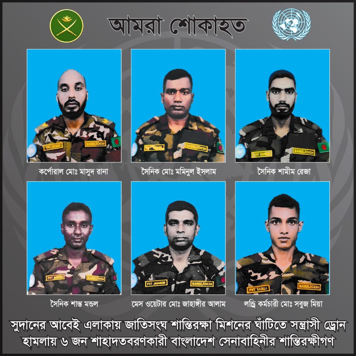 ঢাকা, ১৪ ডিসেম্বর ২০২৫ (রবিবার): সুদানের আবেই এলাকায় জাতিসংঘ শান্তিরক্ষা মিশনের আওতাধীন কাদুগলি লজিস্টিক বেসে গতকাল (শনিবার) স্থানীয় সময় আনুমানিক দুপুর ৩টা ৪০ মিনিট থেকে ৩টা ৫০ মিনিট পর্যন্ত বিচ্ছিন্নতাবাদী সশস্ত্র গোষ্ঠী কতৃক ড্রোন হামলা পরিচালনা করা হয়। উক্ত হামলায় দায়িত্বরত ৬ (ছয়) জন বাংলাদেশি শান্তিরক্ষী শহীদ হন এবং ৮ (আট) জন শান্তিরক্ষী আহত হন।