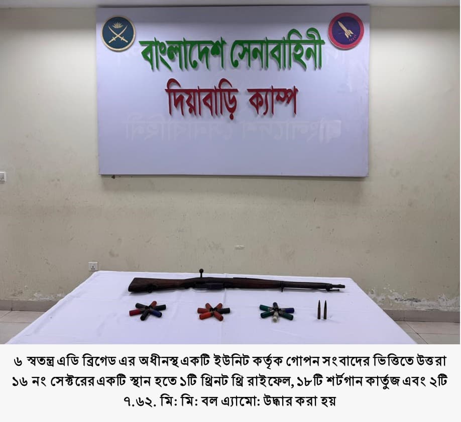 এরই ধারাবাহিকতায় ০৬ জুন রাত ০০৩০-০৪৩০ ঘটিকা পর্যন্ত উত্তরার বিভিন্ন সেক্টরের ০৪টি স্থানে গোপন সংবাদের ভিত্তিতে অভিযান পরিচালনা করা হয়। উক্ত অভিযানে উত্তরা ১৬ নং সেক্টর হতে ১টি থ্রি নট থ্রি রাইফেল, ১৮টি শটগান কার্তুজ এবং ২টি ৭.৬২ মি: মি: গুলি উদ্ধার করা হয়। অভিযানে কাউকে গ্রেফতার করা সম্ভব হয়নি। প্রয়োজনীয় তল্লাশী শেষে প্রাপ্ত অবৈধ রাইফেল, শটগান কার্তুজ ও গুলি তুরাগ থানায় হস্তান্তর করা হয়েছে।
