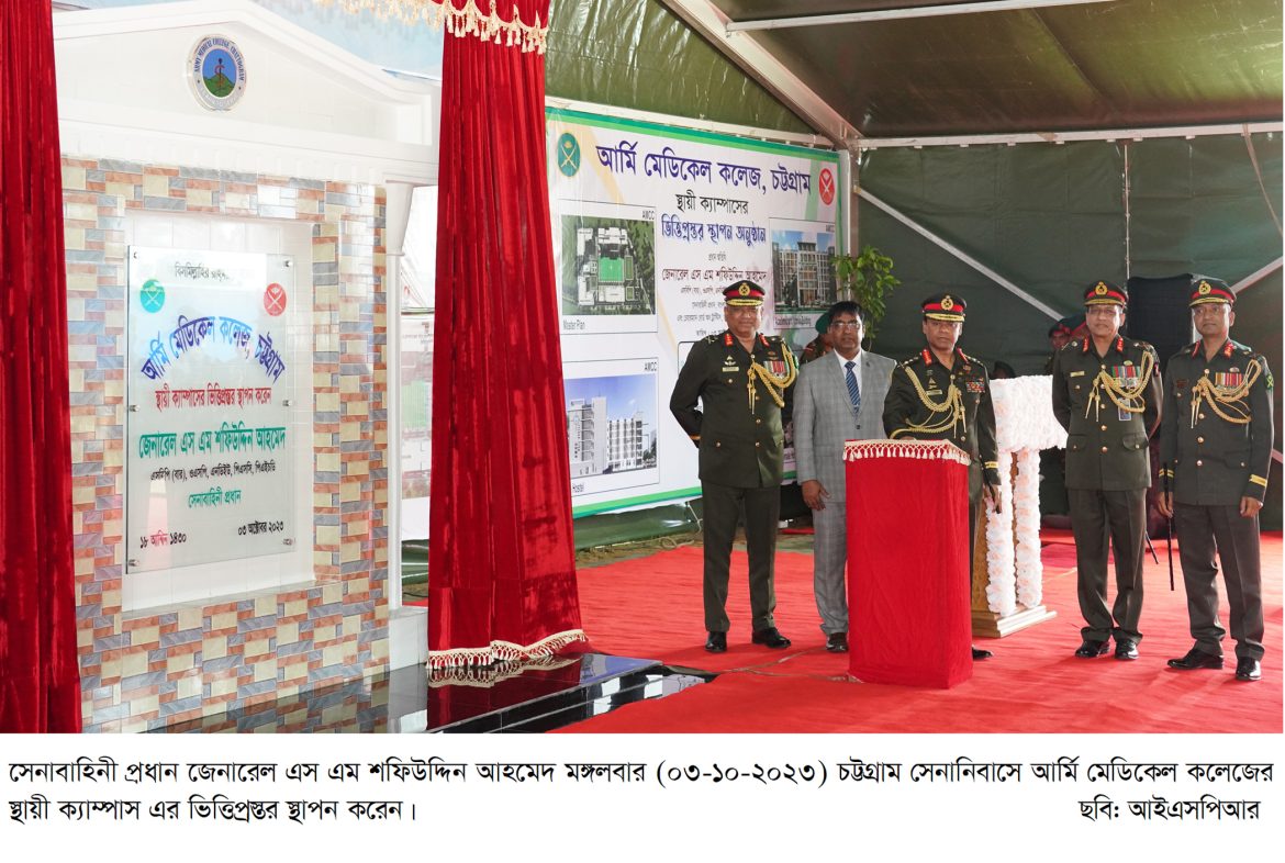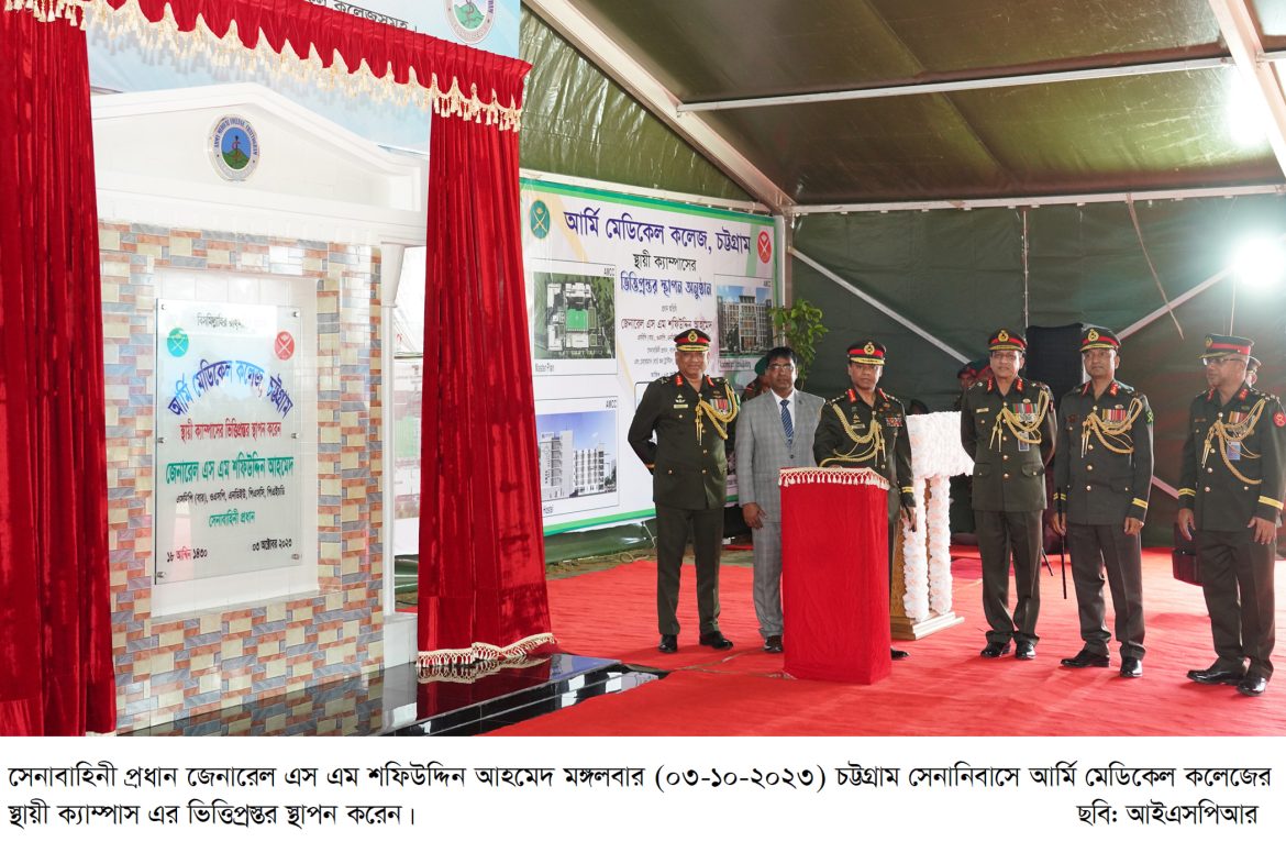 এছাড়াও, আজ চট্টগ্রামে সেনাবাহিনী প্রধান আর্মি মেডিকেল কলেজ এর ভিত্তিপ্রস্তর স্থাপন করেন। এসময় তিনি বলেন, দেশের চিকিৎসা ব্যবস্থার যুগান্তকারী উন্নয়নের লক্ষ্যে ১০ জানুয়ারি বঙ্গবন্ধুর স্বদেশ প্রত্যাবর্তন দিবসে মাননীয় প্রধানমন্ত্রী শেখ হাসিনা ৫টি আর্মি মেডিকেল কলেজ এবং ৬টি সরকারি মেডিকেল কলেজের কার্যক্রম একযোগে শুভ উদ্বোধন ঘোষণা করেন। এরই ধারাবাহিকতায় সেনাবাহিনী প্রধান আর্মি মেডিকেল কলেজ, চট্টগ্রাম এর ভিত্তিপ্রস্তর স্থাপন করেন।