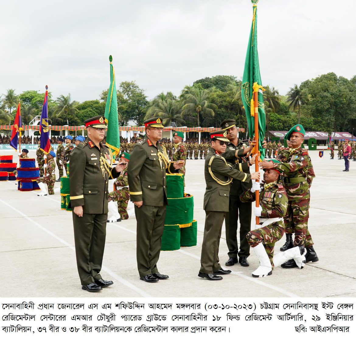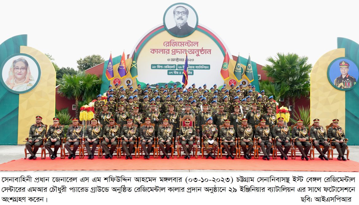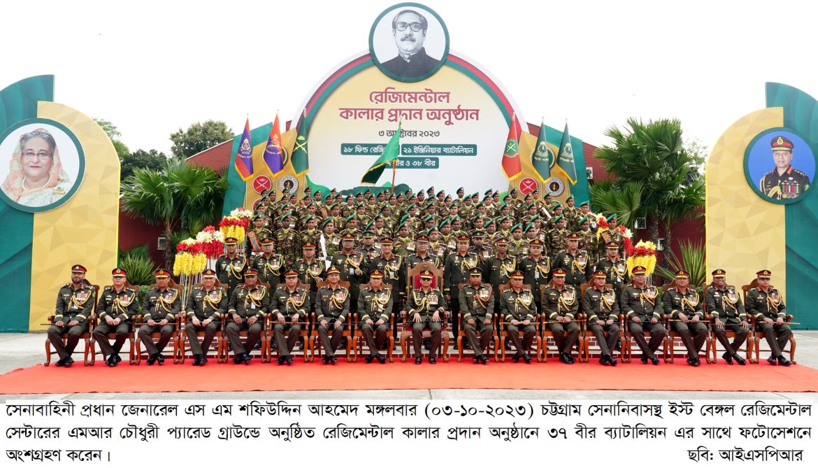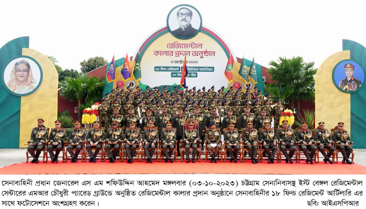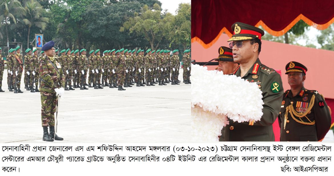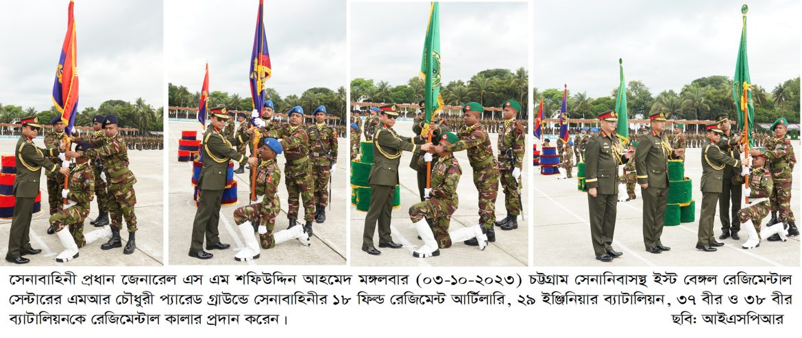 ঢাকা, ০৩ অক্টোবর ২০২৩: বাংলাদেশ সেনাবাহিনীর ৪টি ইউনিটের রেজিমেন্টাল কালার প্রদান অনুষ্ঠান আজ মঙ্গলবার (০৩ অক্টোবর ২০২৩) ইস্ট বেঙ্গল রেজিমেন্টাল সেন্টার, চট্টগ্রাম সেনানিবাসে অনুষ্ঠিত হয়। অনুষ্ঠানে প্রধান অতিথি হিসেবে উপস্থিত ছিলেন সেনাবাহিনী প্রধান জেনারেল এস এম শফিউদ্দিন আহমেদ, এসবিপি (বার), ওএসপি, এনডিইউ, পিএসসি, পিএইচডি। এ উপলক্ষ্যে ইস্ট বেঙ্গল রেজিমেন্টাল সেন্টারের এমআর চৌধুরী প্যারেড গ্রাউন্ডে সেনাবাহিনী প্রধান উপস্থিত হলে জেনারেল অফিসার কমান্ডিং আর্মি ট্রেনিং অ্যান্ড ডকট্রিন কমান্ড এবং জেনারেল অফিসার কমান্ডিং ২৪ পদাতিক ডিভিশন ও এরিয়া কমান্ডার চট্টগ্রাম এরিয়া তাঁকে অভ্যর্থনা জানান। এসময় অধিনায়ক, ১৮ ফিল্ড রেজিমেন্ট আর্টিলারি’র নেতৃত্বে একটি চৌকষ দল কুচকাওয়াজ প্রদর্শন এবং সেনাবাহিনী প্রধানকে সালাম প্রদান করেন।