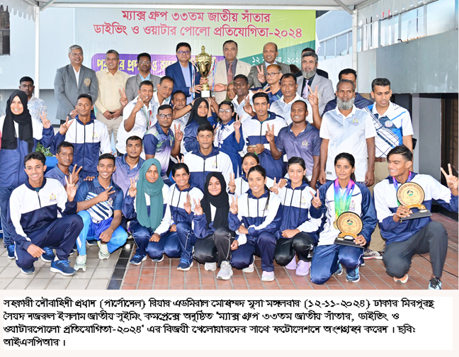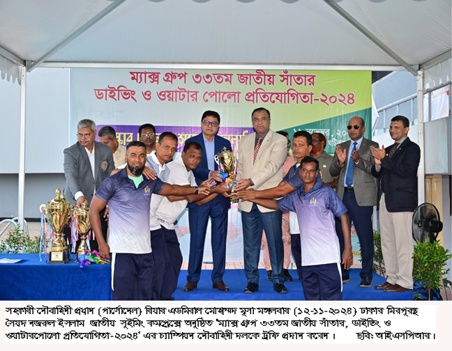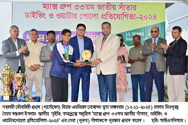 ঢাকা, ১২ নভেম্বর ২০২৪ ঃ বাংলাদেশ সুইমিং ফেডারেশনের ব্যবস্থাপনায় ‘ম্যাক্স গ্রুপ ৩৩তম জাতীয় সাঁতার, ডাইভিং ও ওয়াটারপোলো প্রতিযোগিতা-২০২৪’ এর সমাপনী ও পুরস্কার বিতরণী অনুষ্ঠান আজ মঙ্গলবার (১২-১১-২০২৪) ঢাকার মিরপুরস্থ সৈয়দ নজরুল ইসলাম জাতীয় সুইমিং কমপ্লেক্সে অনুষ্ঠিত হয়। উক্ত অনুষ্ঠানে সহকারী নৌবাহিনী প্রধান (পার্সোনেল) রিয়ার এডমিরাল মোহাম্মদ মুসা প্রধান অতিথি হিসেবে উপস্থিত থেকে বিজয়ীদের মাঝে পুরস্কার বিতরণ করেন। প্রধান অতিথি তাঁর ভাষণে প্রতিযোগিতায় অংশগ্রহণকারী সাঁতারুদের যথাযথ প্রশিক্ষণের মাধ্যমে নিজেদেরকে আরও দক্ষ সাঁতারু হিসেবে গড়ে তোলার আহ্বান জানান, যাতে আন্তর্জাতিক পর্যায়ে প্রতিযোগিতায় অংশগ্রহণ করে দেশ ও জাতির সুনাম বয়ে আনতে পারে। সমাপনী অনুষ্ঠানে অন্যান্যের মধ্যে সেনা, নৌ ও বিমান বাহিনীর উচ্চপদস্থ কর্মকর্তাগণ, বাংলাদেশ সুইমিং ফেডারেশনের কর্মকর্তাবৃন্দ, ম্যাক্স গ্রুপের চেয়ারম্যান এবং অংশগ্রহণকারী সাঁতারুসহ সাধারণ দর্শক উপস্থিত ছিলেন।