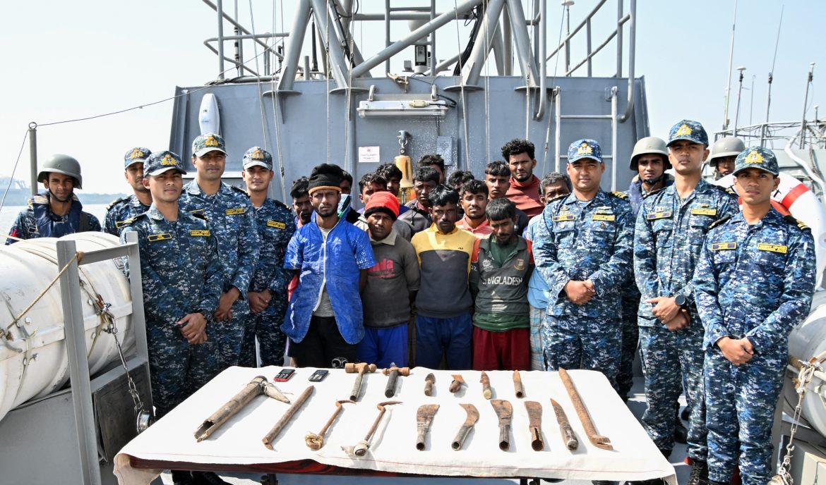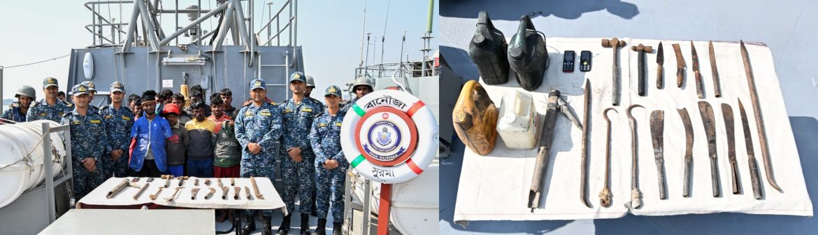 চট্টগ্রাম, ২৭ ফেব্রুয়ারি ২০২৫: বঙ্গোপসাগরের বহিঃনোঙ্গর এলাকায় অভিযান চালিয়ে বৃহস্পতিবার (২৭-০২-২০২৫) মধ্যরাত ০২০০ ঘটিকায় অবৈধ দেশীয় অস্ত্রসহ ১৭ জন চোরকে আটক করেছে বাংলাদেশ নৌবাহিনী জাহাজ সুরমা। অভিযানে ইঞ্জিন চালিত কাঠের বোটসহ রামেল, ছুরি, হাতুড়ি, মোবাইল এবং বিভিন্ন রকমের লাইট জব্দ করা হয়। যার আনুমানিক মূল্য ৫ লক্ষ ৫০ হাজার টাকা। পরবর্তীতে জব্দকৃত মালামালসহ আকটকৃদের আইনানুগ ব্যবস্থা গ্রহণের জন্য স্থানীয় থানায় হস্তান্তর করা হয়। বঙ্গোপসাগরের কুতুবদিয়ার দক্ষিণে একটি সংঘদ্ধ দল কাঠের নৌকার মাধ্যমে চুরির প্রস্তুতি নিচ্ছে বলে সংবাদ পাওয়া যায়। প্রাপ্ত সংবাদের ভিত্তিতে কুতুবদিয়ার উত্তরে টহলরত বাংলাদেশ নৌবাহিনী জাহাজ সুরমা অতি দ্রুত ঘটনাস্থলে পৌঁছায়। ঘটনাস্থল হতে ইঞ্জিন চালিত কাঠের বোটসহ চোর চক্রের ১৭ সদস্যকে আটক করে। এ সময় কোন ধরনের হতাহতের ঘটনা ঘটেনি। উল্লেখ্য, বঙ্গোপসাগরের বহিঃনোঙ্গর ও তদ্সংলগ্ন এলাকায় নিয়োজিত নৌবাহিনী জাহাজ ও অন্যান্য মেরিটাইম সংস্থাসমূহ নিয়মিত টহল এবং আভিযানিক কার্যক্রম পরিচালনা করে আসছে। ভবিষ্যতেও এ ধরনের অভিযান অব্যাহত থাকবে।