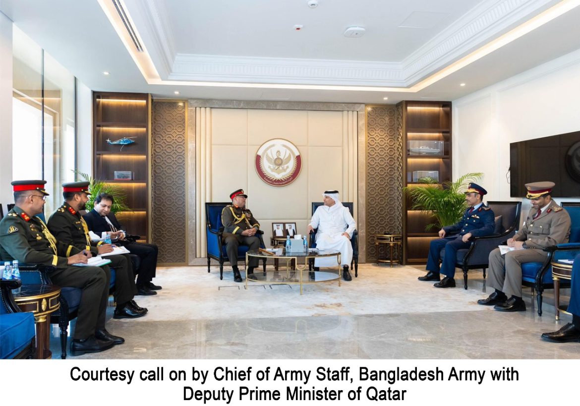 On 03 May 2025, the Army Chief paid a courtesy call on with H.E. Sheikh Joaan bin Hamad bin Khalifa Al Thani, President of the Qatar Olympic Committee. During the meeting, they discussed various issues of mutual interest including cooperation between the Olympic Committees of both countries, support for sports-related training, development of bilateral relations, and the prospect of establishing an Olympic Village in Bangladesh.
