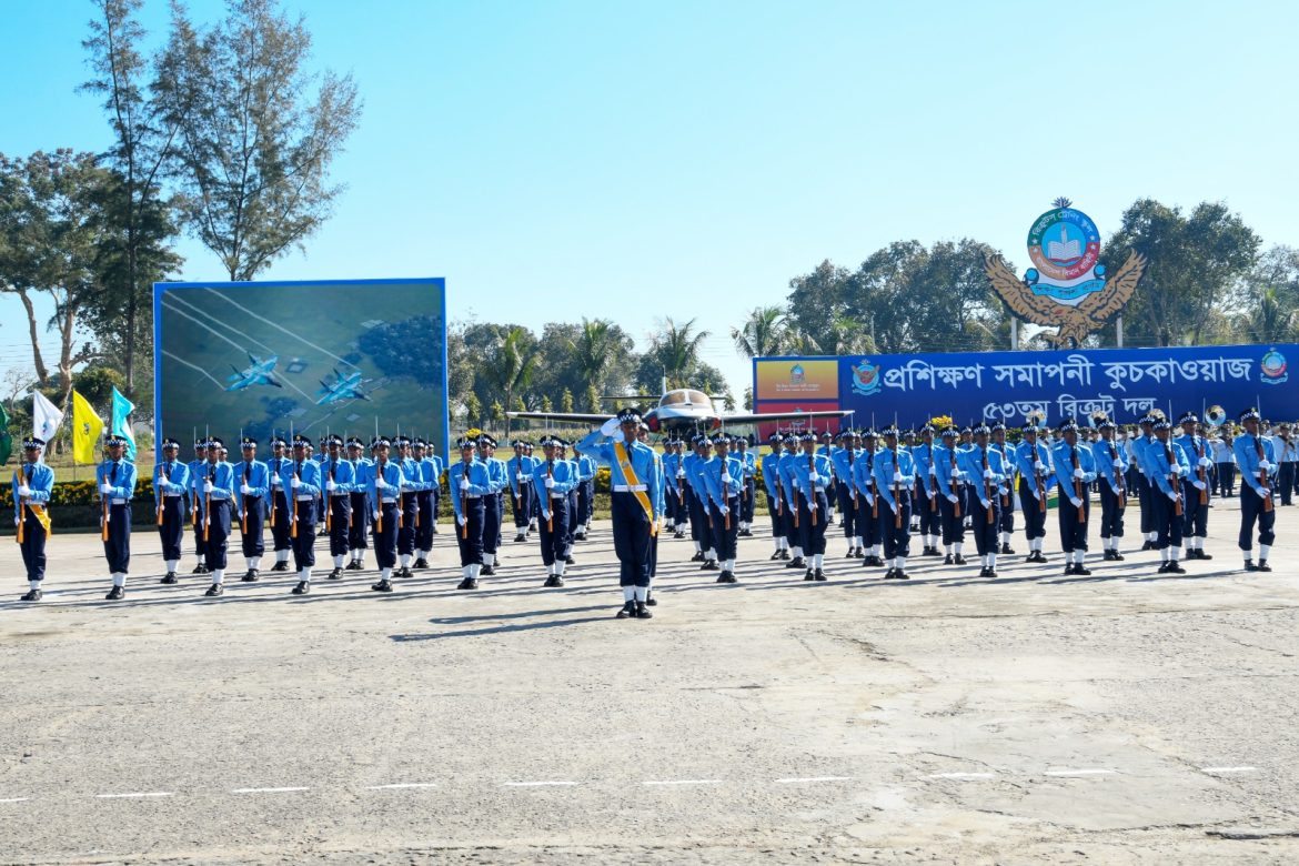এ কুচকাওয়াজের মধ্য দিয়ে আজ মোট ৪৪১ জন রিক্রুট বাংলাদেশ বিমান বাহিনীতে অন্তর্ভুক্ত হলো। এসি-২ মোঃ ওমর ইবনে নোমান এবং এসি-২ রেদোয়ান আহম্মেদ যথাক্রমে শিক্ষা ও জেনারেল সার্ভিস ট্রেনিং-এ সেরা রিক্রুট বিবেচিত হন। এসি-২ মোঃ ওমর ইবনে নোমান, সার্বিক বিষয়ে কৃতিত্বের জন্য শ্রেষ্ঠ রিক্রুট বিবেচিত হওয়ার গৌরব অর্জন করেন। এর আগে বিমান বাহিনী প্রধান প্যারেড গ্রাউন্ডে এসে পৌঁছালে বিমান বাহিনী ঘাঁটি বীর উত্তম এ কে খন্দকার-এর এয়ার অধিনায়ক এয়ার ভাইস মার্শাল মোহাম্মদ খায়ের উল আফসার, জিইউপি, এনডিসি, পিএসসি এবং রিক্রুটস ট্রেনিং স্কুলের অধিনায়ক গ্রুপ ক্যাপ্টেন মোঃ খায়রুল বাসার, পিএসসি তাঁকে স্বাগত জানান।