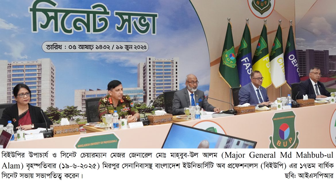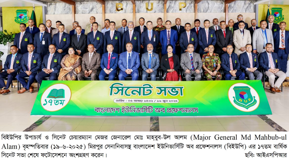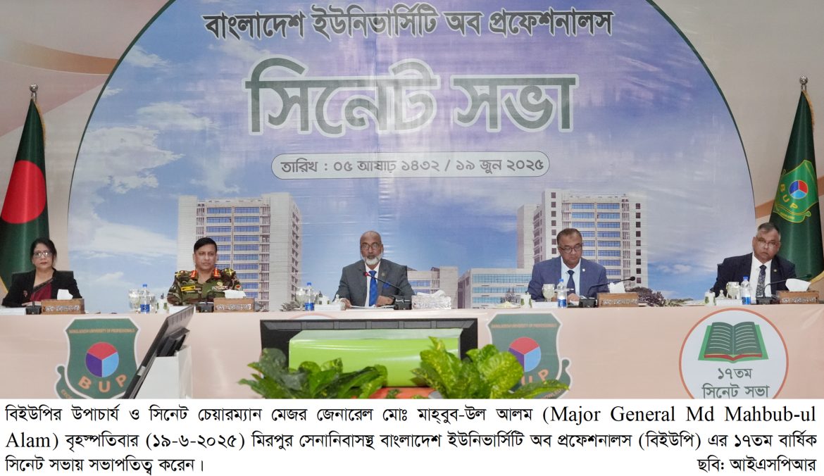 Dhaka, 19 June 2025: The 17th Annual Senate Meeting of Bangladesh University of Professionals (BUP) was held on Thursday (19-6-2025) at the Bijoy Auditorium of BUP. BUP Vice Chancellor and Senate Chairman Major General Md Mahbub-ul Alam, BSP, ndc, afwc, psc, MPhil, PhD presided over the meeting.