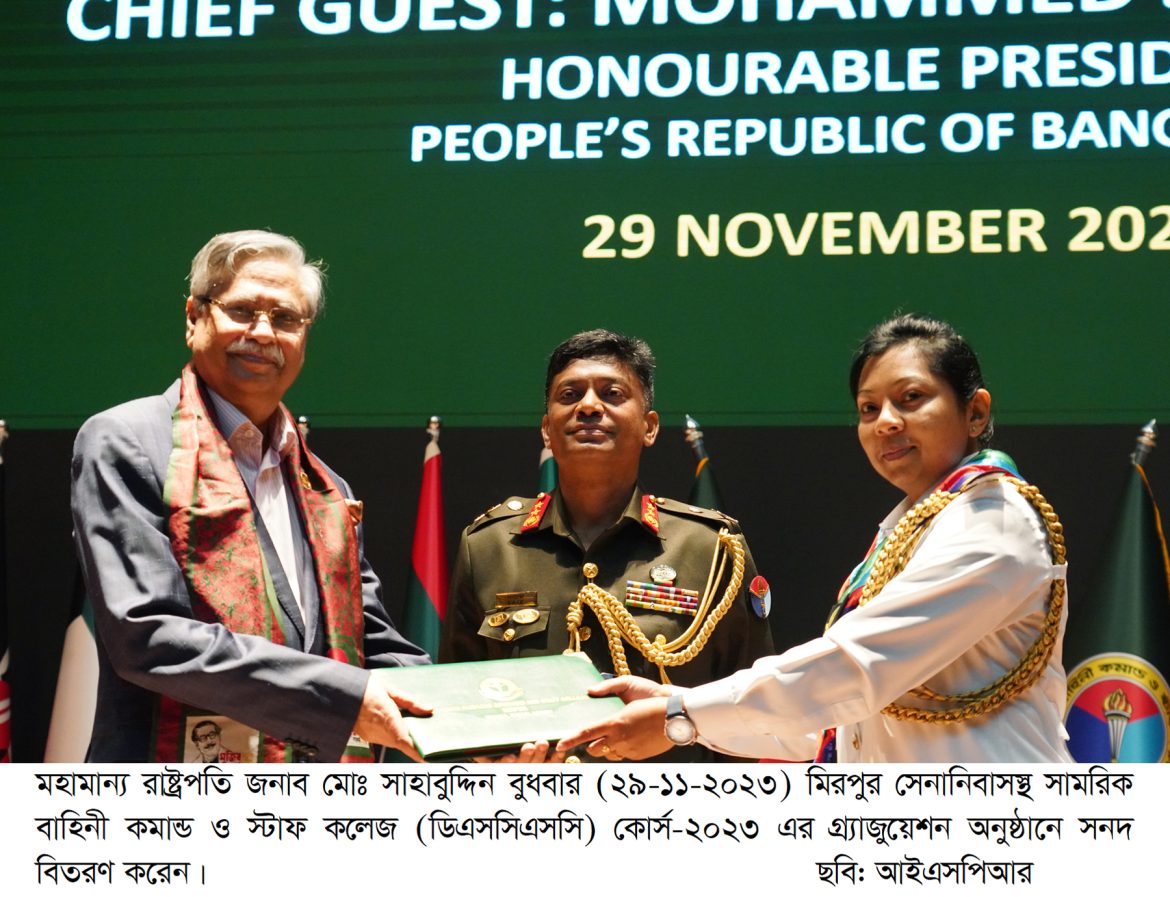 Dhaka, 29 November 2023: The Graduation Ceremony of Defence Services Command and Staff College (DSCSC) Course-2023 was held on 29 December (Wednesday) 2023 at Sheikh Hasina Complex Auditorium, DSCSC, Mirpur Cantonment, Dhaka.