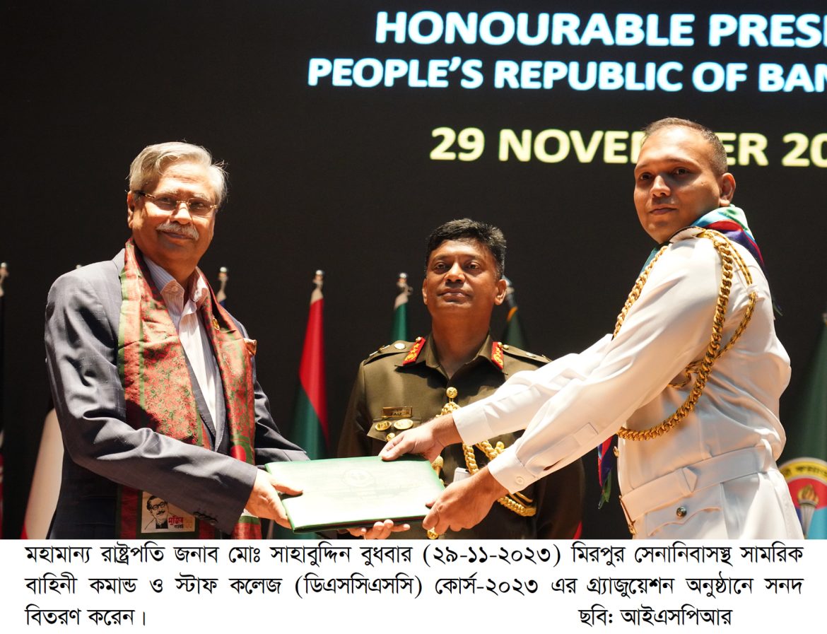 The Honourable President Mohammed Shahabuddin, graced the occasion as the Chief Guest and gave away certificates (psc) to the graduating officers. The ceremony is a testament to the commitment of the DSCSC to fostering international collaboration and enhancing the strategic acumen of military leaders. The Honourable President began by expressing his deepest respect for Bangabandhu Sheikh Mujibur Rahman, the Father of the Nation, and the Greatest Bengali of all time. After giving away certificates to the recipients, the Honourable President congratulated all the graduates on their successful completion of the course. He advised them to apply their newly acquired wisdom, resolve, and zeal to the advancement of their respective nations. Additionally, he thanked Commandant DSCSC for seeing the successful completion of DSCSC Course-2023.