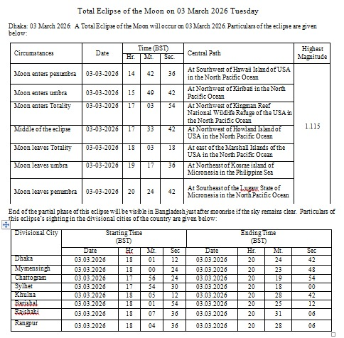 Breaking NewsInter Service Organizationহোম Total Eclipse of the Moon on 03 March 2026 Tuesday Author: আইএসপিআর মার্চ ১, ২০২৬ Author: আইএসপিআর মার্চ ১, ২০২৬ ৫ 0 FacebookTwitterPinterestEmail আইএসপিআর Before Post MIST and BEPRC jointly Organize Symposium on Sustainable Technologies for Bangladesh’s Clean Energy Transition সম্পর্কিত পোস্ট MIST and BEPRC jointly Organize Symposium on Sustainable... ফেব্রুয়ারি ১৮, ২০২৬ INTER BASE QUIRAT AND AZAN COMPETITION-2026 OF BANGLADESH... ফেব্রুয়ারি ১৭, ২০২৬ BAF OBSERVED 57TH DEATH ANNIVERSARY OF SHAHEED SERGEANT... ফেব্রুয়ারি ১৫, ২০২৬ Annular eclipse of the sun on 17 February... ফেব্রুয়ারি ১৫, ২০২৬ MIST Organized The Inaugural Responsible AI Summit in... জানুয়ারি ১৮, ২০২৬ CERTIFICATE AWARD CEREMONY OF NO 130 JUNIOR COMMAND... জানুয়ারি ১৫, ২০২৬ CLOSING CEREMONY OF INTER-SERVICE HOCKEY COMPETITION-2025 ডিসেম্বর ২৪, ২০২৫ False and Misleading Reports on the Alleged Sinking... ডিসেম্বর ১৬, ২০২৫ বাংলাদেশ বিমান বাহিনীর নব বিমানসেনা দলের প্রশিক্ষণ সমাপনী... ডিসেম্বর ১১, ২০২৫ Letter of Intent (LOI) signed between Bangladesh Air... ডিসেম্বর ৯, ২০২৫